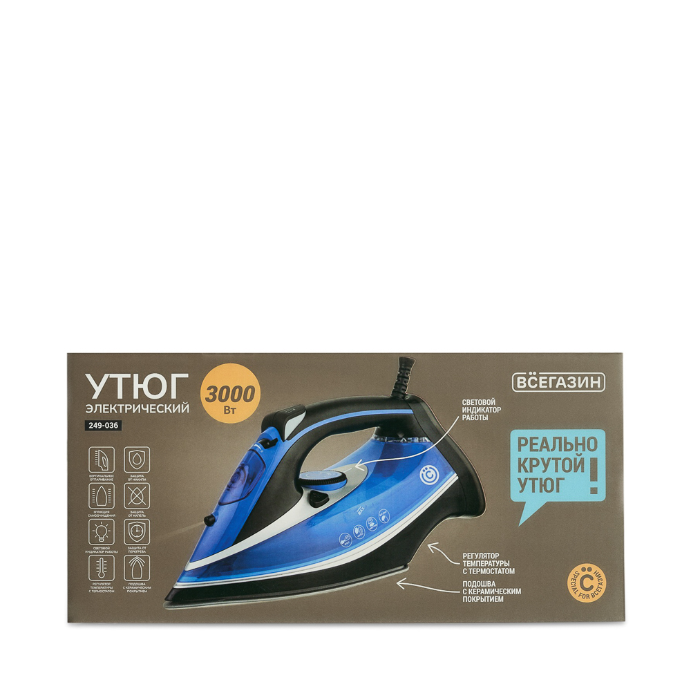 Утюг с отпаривателем ВСЁГАЗИН мощностью 3000 Вт сделает глажку быстрой и удобной. Противокапельная система защищает одежду от влаги, режим самоочистки легко удаляет накипь, керамическая подошва скользит по любым тканям, а мощный паровой удар справляется с самыми сложными складками. Утюг также можно использовать для вертикального отпаривания.